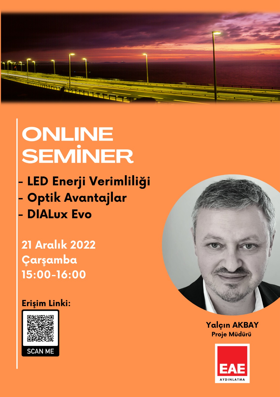 EAE Aydınlatma Proje Müdürü Yalçın AKBAY tarafından 21 Aralık 2022 Çarşamba günü 15:00-16:00 arasında yapılacak olan online seminere QR kod üzerinden kaydolabilirsiniz.
