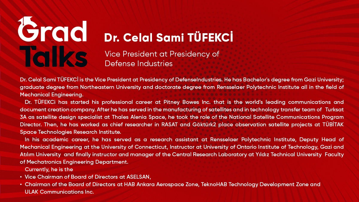 Fen Bilimleri Enstitüsü tarafından düzenlenen "Grad Talks" serisinin ikinci semineri 16 Aralık 2020 Çarşamba günü Saat 17.00'de zoom üzerinden yapılacaktır. Grad Talks Seminer Serisinin ikinci konuğu Savunma Sanayii Başkan Yardımcısı Dr. Celal Sami Tüfekçi olacaktır. Detaylı bilgi aşağıda sunulmuştur. Konu ile ile ilgilenen tüm paydaşlarımız davetlidir.