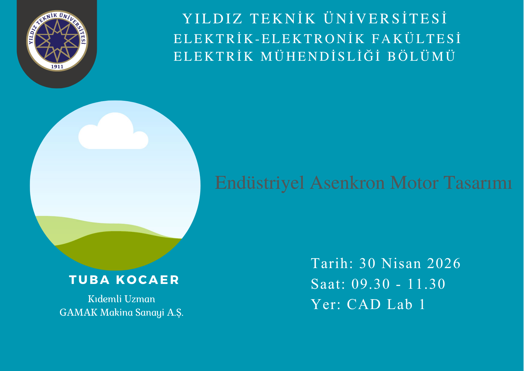 Sanayi-Üniversite iş birliği kapsamında düzenlenecek olan seminer, GAMAK Makina Sanayi A.Ş.’den Kıdemli Uzman Tuba KOCAER tarafından verilecek “Endüstriyel Asenkron Motor Tasarımı” konulu sunum hk.
